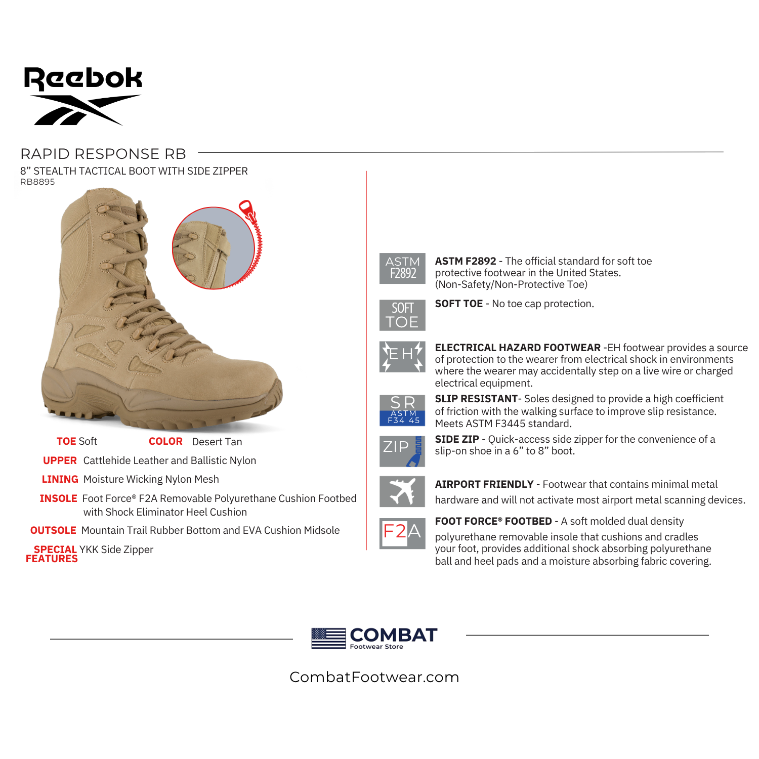 Reebok Rapid Response 8" stealth side-zip military boots in desert tan are built for troops, first responders, and law enforcement who need proven durability with all-day comfort. These men’s 8" tactical boots combine tough cattle hide leather and ballistic nylon with a moisture-wicking nylon mesh lining, delivering breathable support for ruck marches, long patrols, and rugged urban or desert environments.