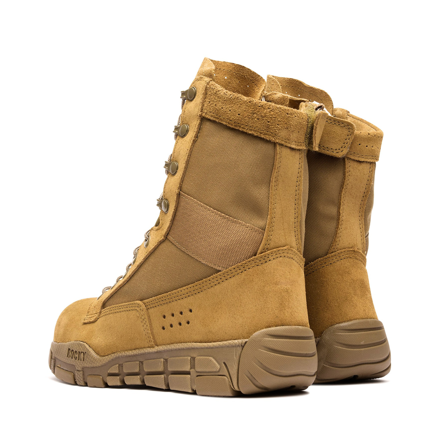 The upper is expertly crafted from a highly durable blend of full-grain flesh-out leather and rugged 900-denier CORDURA® nylon. For rapid response, it features a heavy-duty YKK side zipper paired with a NATO hook speed lacing system, allowing for instant donning and doffing. Underfoot, the multi-hazard rubber outsole aggressively resists slips, oils, heat, abrasions, chemicals, and metal chips. Combined with an impact-absorbing EVA midsole and the supportive Rocky Airport™ footbed, this GSA-compliant tactical boot ensures maximum energy return and comfort during grueling 12-hour shifts.